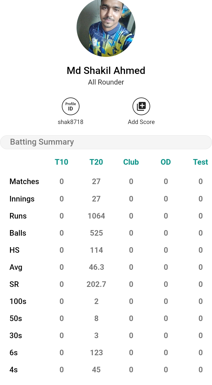 He Hits Most 6s and 4s for the team of Superstar. He hits 123 sixes and 45 Fours. He is the pinch hitter For the team of Superstar Sporting Club.